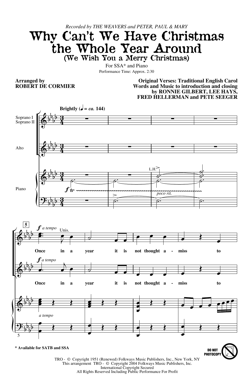 This arrangement of We Wish You a Merry Christmas was written for the legendary American folk group Peter, Paul and Mary by the great choral conductor and arranger Robert De Cormier. With a special set of lyrics, this wonderful SATB setting makes a plea for peace and brotherhood throughout the world. Available for SATB and Piano. Performance Time: Approx. 2:30