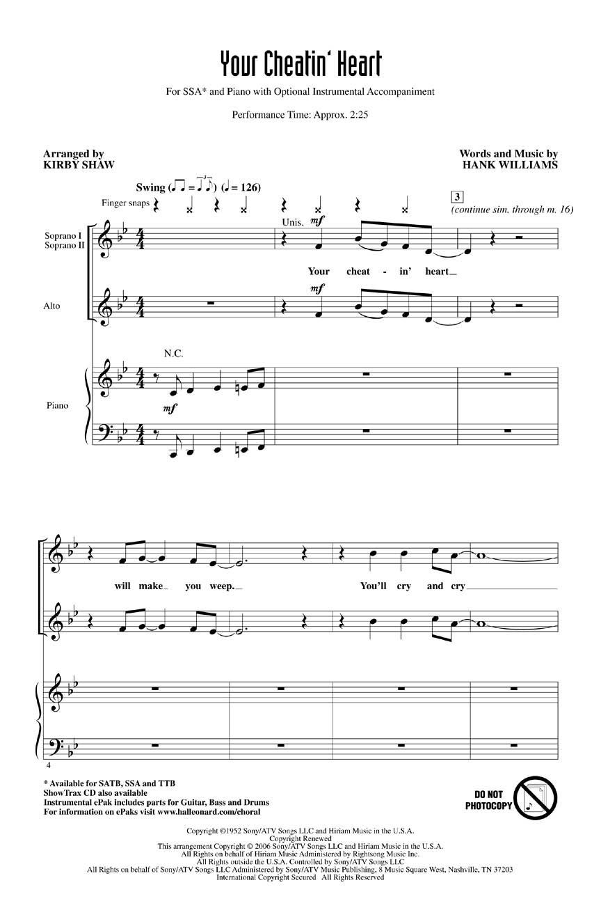 This classic tune by the legendary singer/songwriter Hank Williams gets a jazz-flavored makeover that's brimming with personality and pizzazz. Available for SATB, SSA, TTB, ShowTrax CD and Instrumental ePak. Performance Time: Approx. 2:25.