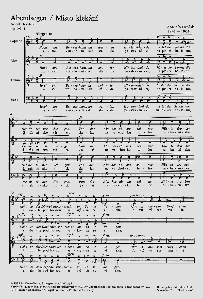 Die Chöre op. 29 sind vorwiegend in einfacher homophoner Vierstimmigkeit und unkomplizierter Form abgefasst, doch verbirgt sich hinter ihrer Schlichtheit so mancher Reiz eines echten Dvorák.