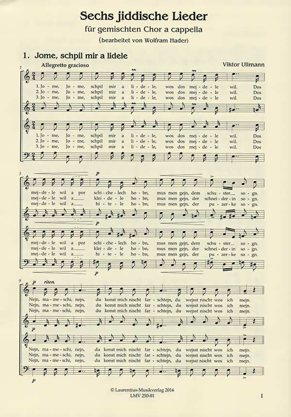 In Theresienstadt schrieb Ullmann auch eine ganze Reihe von Liedern und Chören auf hebräische und jiddische Texte. Sechs dieser Sätze nach jiddischen Liedern, die Ullmann ursprünglich für Frauen- bzw. Männerchor komponiert hatte, erscheinen nun erstmals in einer Bearbeitung für gemischten Chor von Wolfram Hader.