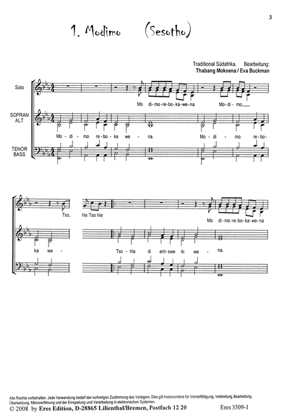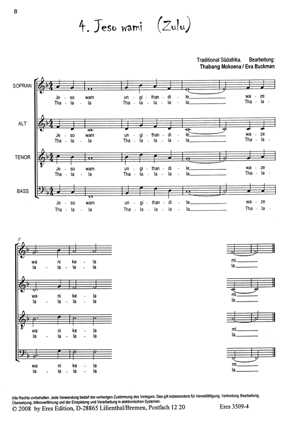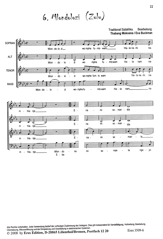 Auf der Suche nach authentischer afrikanischer Chorliteratur für Laienchöre bereist Chorleiterin Eva Buckman seit vielen Jahren verschiedene afrikanische Länder. In Südafrika traf sie auf den charismatischen Chorleiter Thabang Mokoena, mit dem sie gemeinsam mit seinen und ihren Chören Workshops und Konzerte veranstaltete und der auch eigene Kompositionen nach traditionellen Vorbildern zu dieser Sammlung beisteuerte.