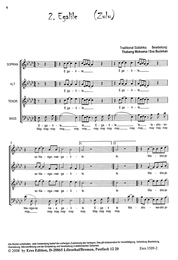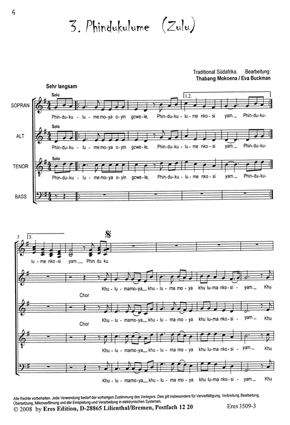 Die hier erstmals in notierter Form vorliegenden Lieder werden in Südafrika traditionell nur mündlich weiter gegeben. Es war daher eine besondere Herausforderung sie so umzusetzen, dass sie auch mit europäischen Chören noch 'afrikanisch' klingen können. Hierbei ist es aber besonders wichtig, dass die Titel nicht - wie in unseren Chören allzu oft üblich - bewegungslos und starr, sondern voller Dynamik und Bewegung vorgetragen werden.