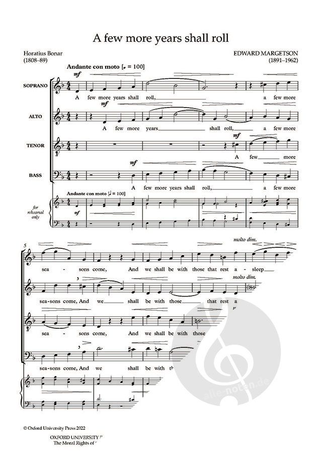 Edward Margetson was born in St. Kitts, British West Indies, immigrating to the United States in 1919. One of only a few published choral works by the composer, A few more years shall roll sets a hymn by Horatius Bonar that was written for his congregation to use on New Year's Day. Margetson's setting is characterized by imitation and powerful word-painting.