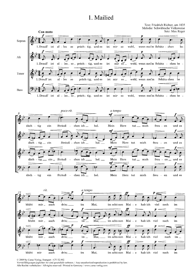 Mit ihrem in jeder Hinsicht ausgefeilten Chorsatz - im späten 19. Jahrhundert wohl nur mit Brahms' Chormusik vergleichbar - lassen Regers Volksliedersammlungen das Gros der damals üblichen Liedertafel-Arrangements weit hinter sich