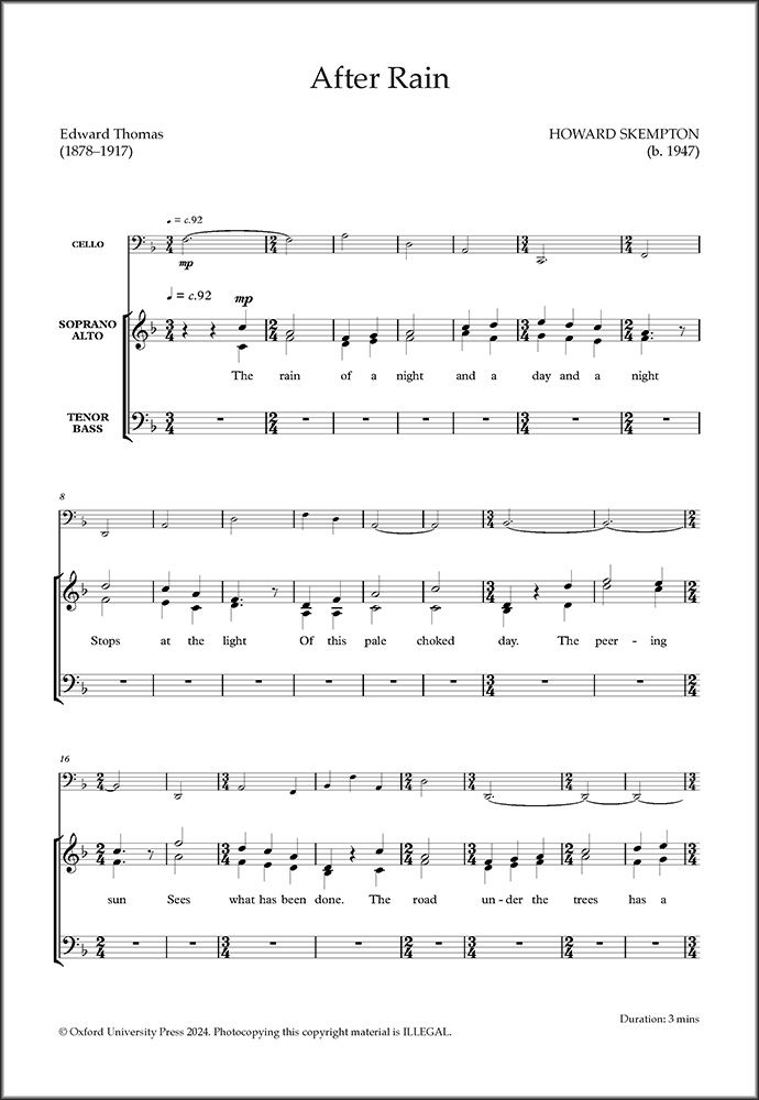 Skempton's After Rain sets an evocative text by Edward Thomas with a contemplative choral part over a rich and slow-moving cello line. Skempton alternates between contrasting upper-voice duets and full four-part homophony that captures the feeling of a winter's day throughout. Offprinted from Music for Choir and Cello.