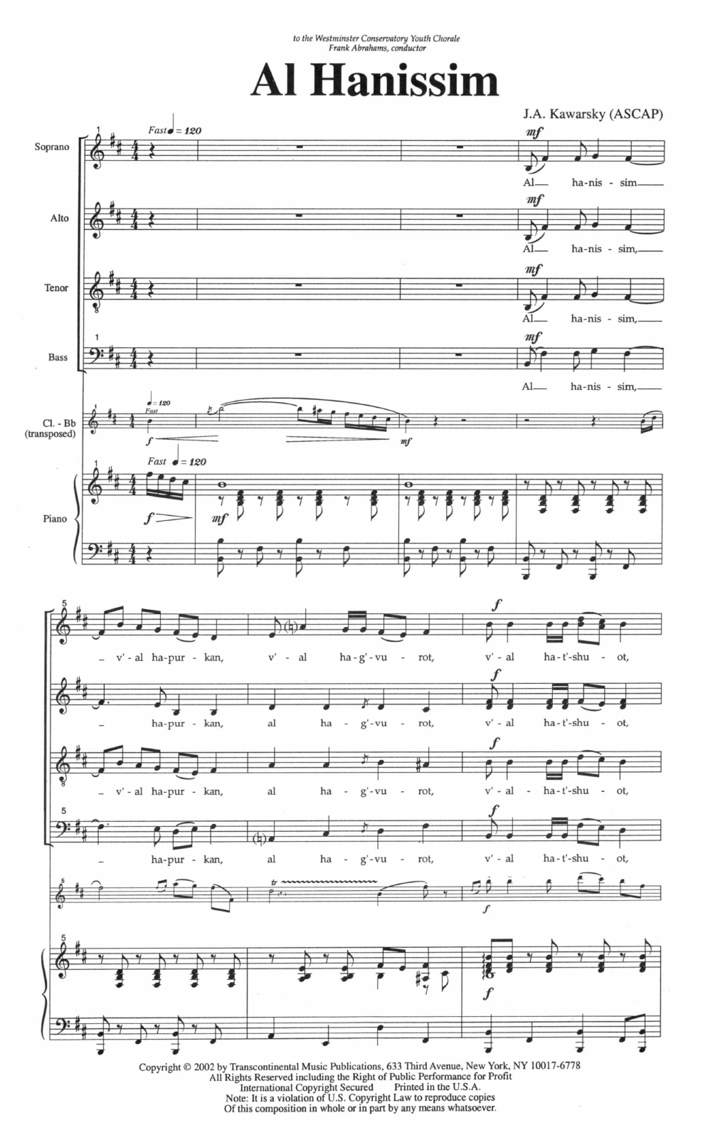 From The Westminster Conservatory Youth Chorale Jewish Music Series. A new rendering of the classic text for Chanukah and other holidays. A show-stopping clarinet part!