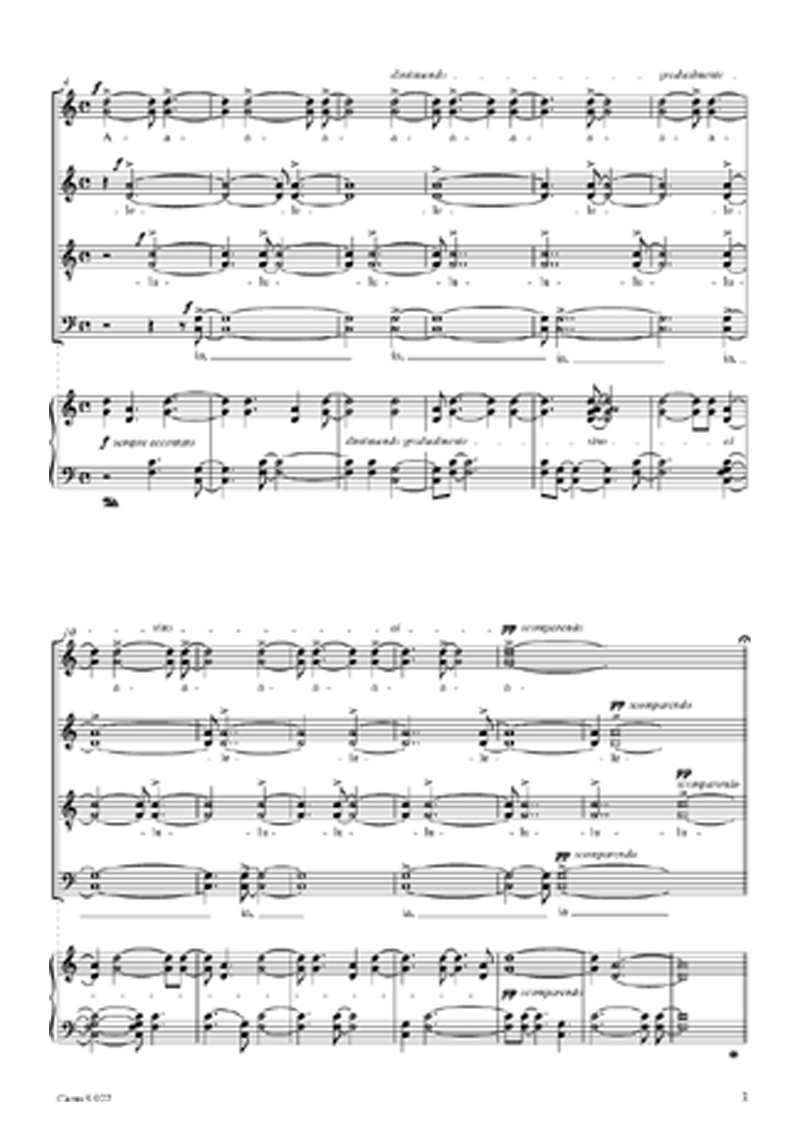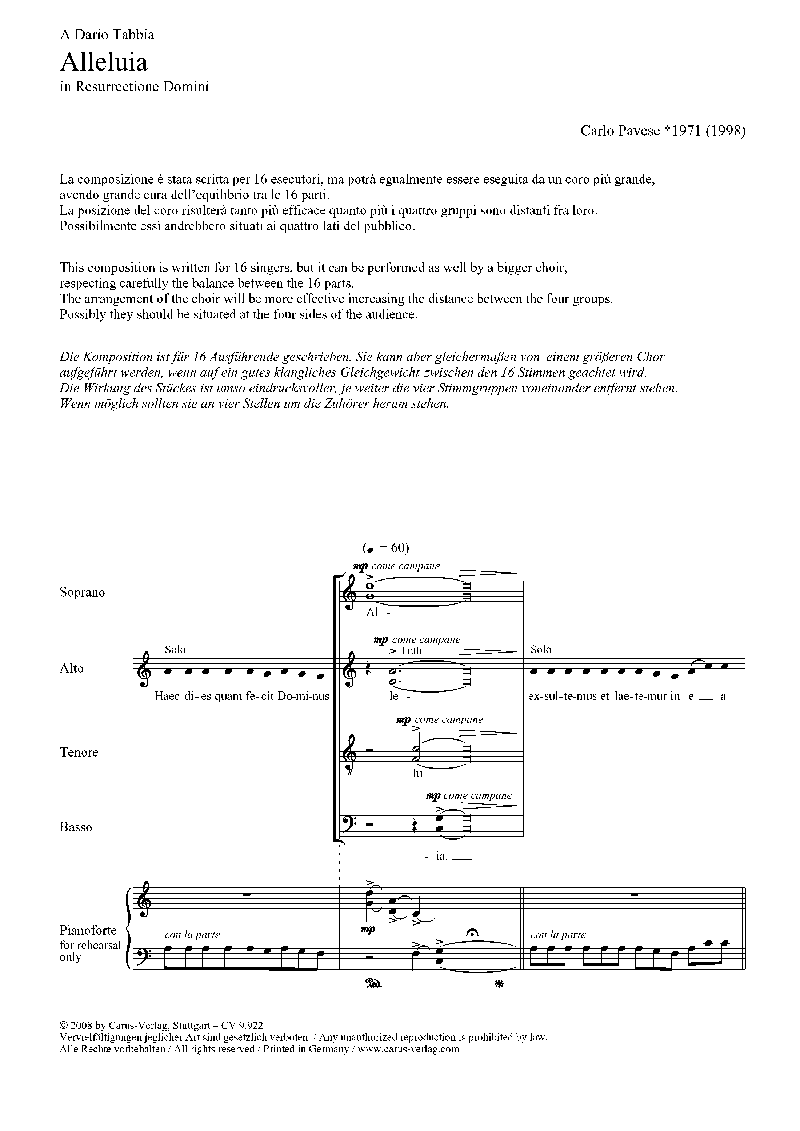 Dieses eindrucksvolle Chorwerk für 16 Stimmen kann ebenso von einem grösseren Chor aufgeführt werden. Hierbei sollte aber auf ein gutes klangliches Gleichgewicht geachtet werden. Das Werk ist ein klanglich vielschichtiges Gewebe. Als Hilfe für das Einstudieren ist eine Klavierstimme vorhanden. - Coro SSSSAAAATTTTBBBB