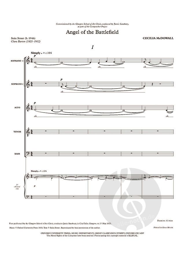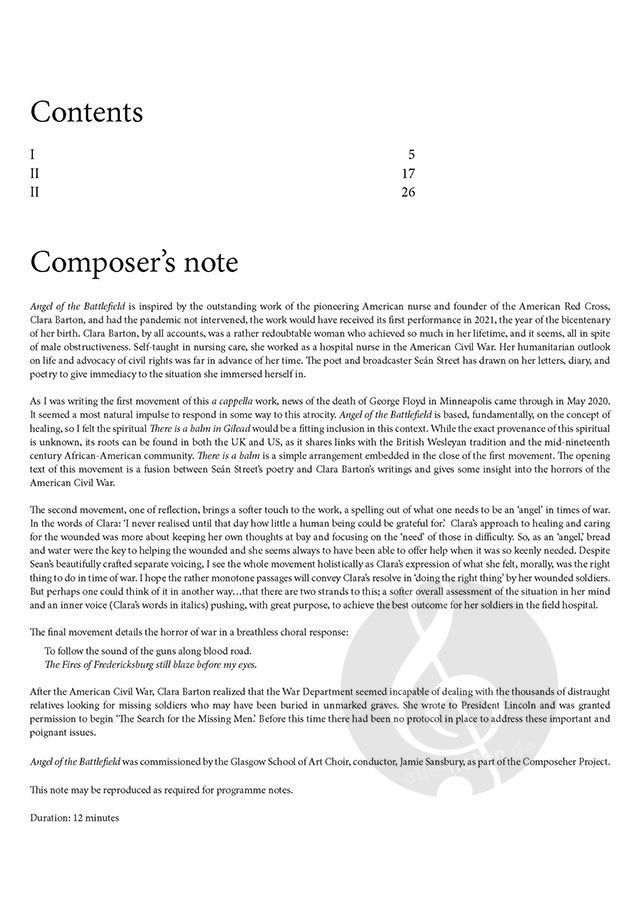 McDowall's moving and poignant setting of this three-movement work is both an exposition on the horrors of war and a celebration of healers. Inspired by renowned nurse Clara Barton, the text is drawn from Barton's own words, the poetry of Séan Street, and the African American spiritual There is a balm in Gilead.