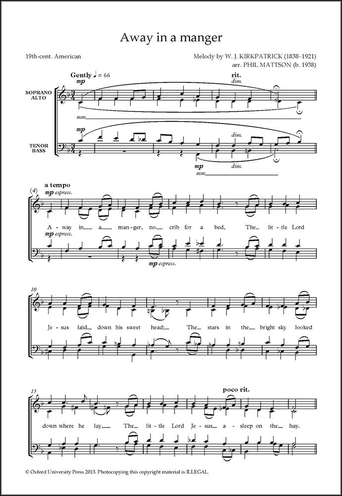 In Phil Mattson's arrangement, the melody and text have been set with some contemporary harmonies, which begin simply and become more complex. Offprinted from the collection An American Christmas, edited by Jerry Rubino.