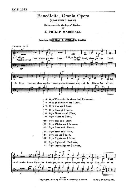 A setting of the canticle is frequently sung at Matins in the Anglican liturgy by J. Philip Marshall (1921-2005), formerly organist at St Botolph's Boston, and Ripon andLincoln Cathedrals.