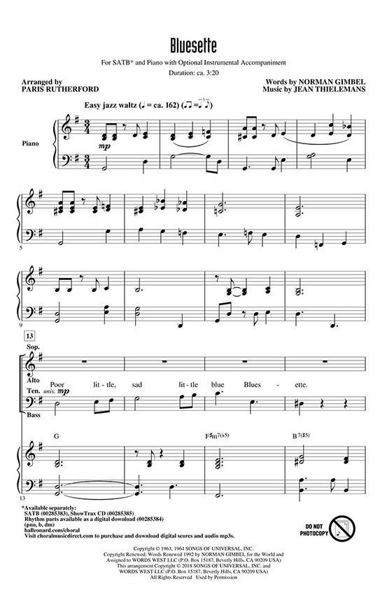 With a melody written by the legendary harmonica player Toots Thielemans, this jazz standard has been covered by 100s of musicians. This arrangement begins simply and purely allowing your jazz choir to establish a groove. A sample scat solo is offered as a beginning point with solid choral underpinning for support. A final time through verse and chorus offers very contemporary jazz harmonies voiced in a way that will ensure success.