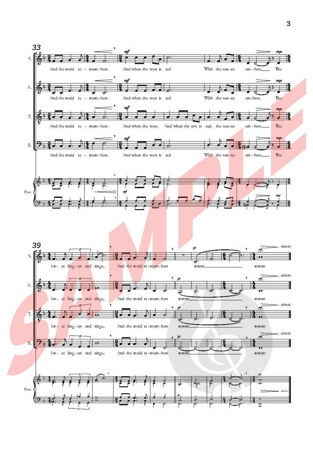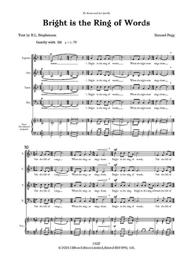 Ein Chorwerk für gemischten Chor SATB (Sopran, Alt, Tenor, Bass) mit dem Titel "Bright is the Ring of Words" basiert auf dem gleichnamigen Gedicht von Robert Louis Stevenson. Der Vokalpartitur liegt eine Keyboard-Begleitung bei.