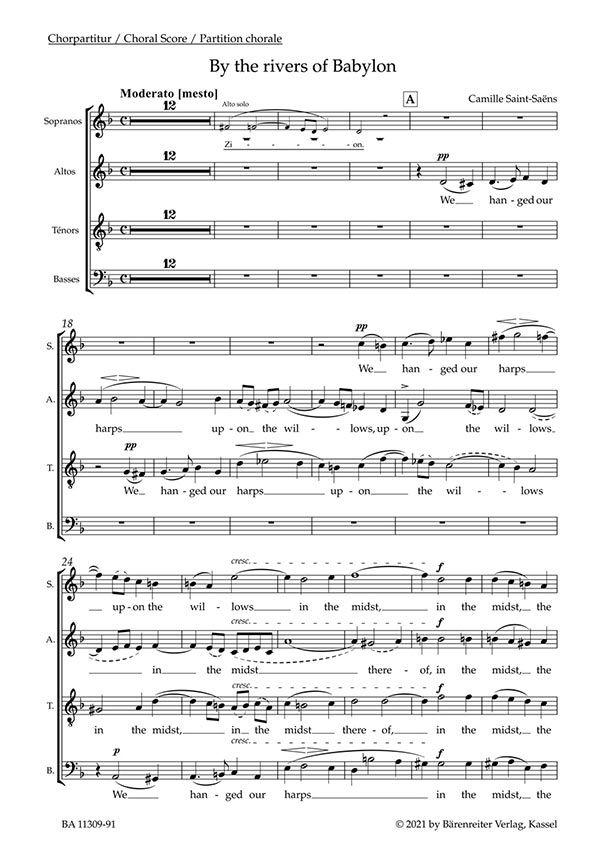 Psalm 137, „Super flumina Babylonis“ bzw. “By the rivers of Babylon”, war für viele Komponisten und Komponistinnen eine Inspiration, und so auch für Camille Saint-Saëns. Immer wieder beschäftigte er sich mit seiner ursprünglich 1854 komponierten Psalmmotette für Sopran solo, gemischten Chor, Saxophon-Quartett, Streichorchester und Orgel. Zwei der insgesamt vier Fassungen – die erste Fassung in lateinischer Sprache sowie eine deutlich spätere englische Fassung für Alt solo, Chor SATB und Klavier – liegen nun nach sorgfältiger Berücksichtigung aller Quellen erstmals in praktischen Urtext-Ausgaben vor.