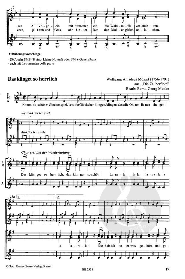 Viele flexible Arrangements bieten die Möglichkeit, Männerstimmen bzw. instrumentale Bassführungen in die Chorarbeit einzubeziehen. Bei vielen Nummern finden sich ausgeschriebene Begleitsätze für Klavier oder Akkordsymbole für instrumentale Begleitung. Mit Kanons und teilweise sehr einfachen Stimmführungen wird in das mehrstimmige Singen eingeführt.