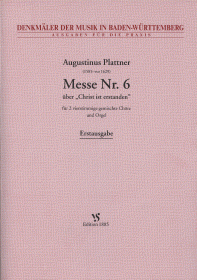 Ostermesse Nr. VI für 2 vierstimmige gemischte Chöre und Orgel, hrsg. von Andreas Traub und Hartmut Schick. Prakt. Ausgabe der Denkmälerausgabe Band 3, STRUBE9101 - Diese praktische Ausgabe bietet eine Einrichtung für die Praxis mit entsprechendem Aufführungsmaterial. Das Notenbild wird in moderner Schlüsselung und gegebenenfalls in verkürzten Notenwerten wiedergegeben. Die Messe Nr. 6 über 'Christ ist entstanden' ist eine von acht überlieferten Messen Augustinus Plattners (1585-vor 1629). Sie ist die umfangreichste, sowohl hinsichtlich der Länge der einzelnen Sätze als auch des Tonumfangs. Probleme bereitete die Aussetzung des Generalbasses. Plattner komponiert in der Tradition der oberitalienischen Mehrchörigkeit des 16. Jhs. mit ihrer blockhaften Klanglichkeit. Zugunsten der besseren Lesbarkeit wurde auf die übliche Verkleinerung der Noten bei der Darstellung des ausgesetzten Generalbasses verzichtet.
