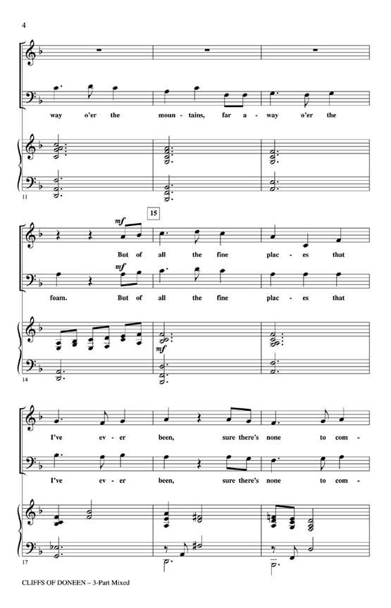 But of all the fine places that I've ever been; sure there's none can compare with the cliffs of Doneen. Experience the rich heritage of the Emerald Isle with this beautiful setting of the beloved folk song. Available for 3-Part Mixed, 2-Part and ShowTrax CD. Performance Time: Approx. 2:20.
