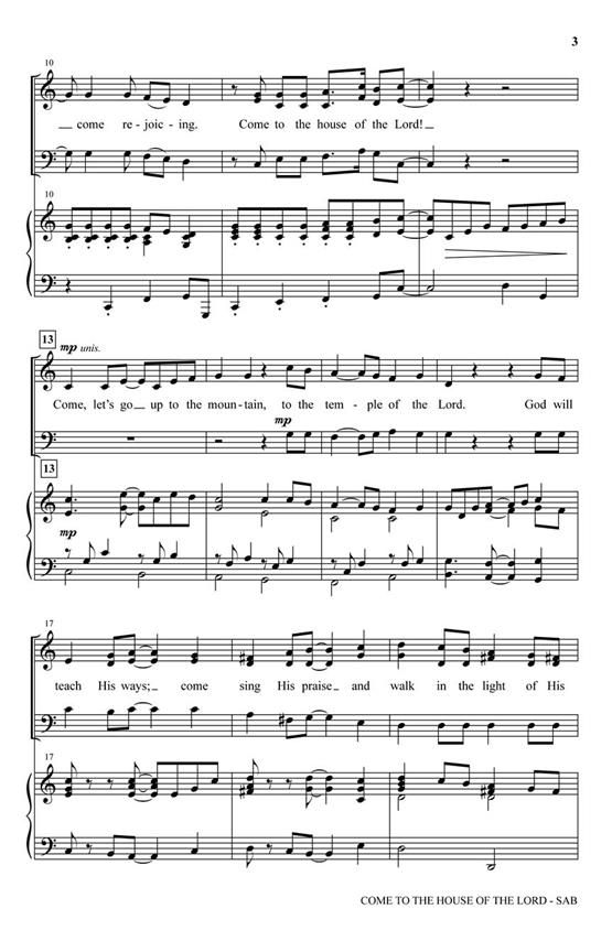 Uses: Advent, Call to Worship, General Scripture: Genesis 28:16-17, Psalm 121:1, Isaiah 2:1-5, I Timothy 3:15 Galloping confidently forward, this rhythmic praise anthem is filled with inviting lyrics and music. A syncopated opening theme announces the confident intent of the piece calling the faithful to gather for worship with great rejoicing. Contrasting sections add variety and incorporate the prophetic passages of Isaiah's vision of a world where peace is at last the inheritance. A jubilant piano accompaniment builds security and drives the choir to a convincing ending. A great up-tempo Advent call to worship!