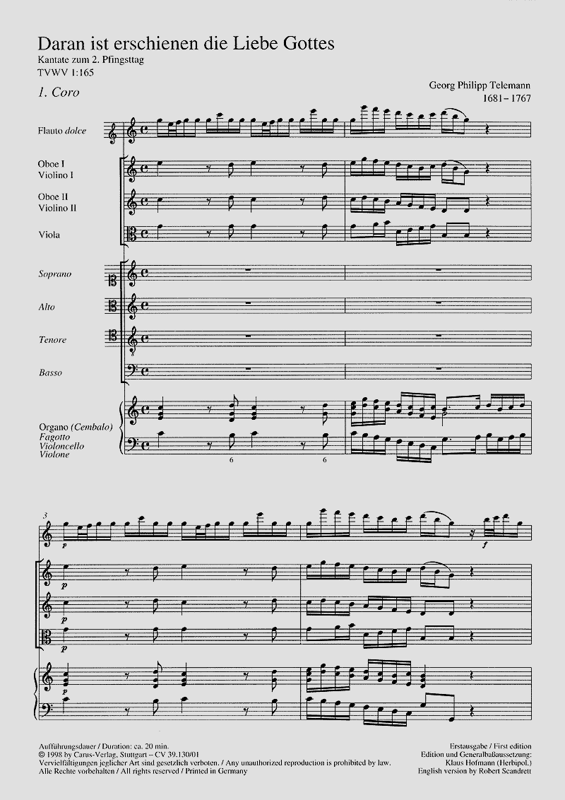 - Soli, Gemischter Chor (SATB), Altblockflöte, 2 Oboen, Streicher und Basso Continuo
