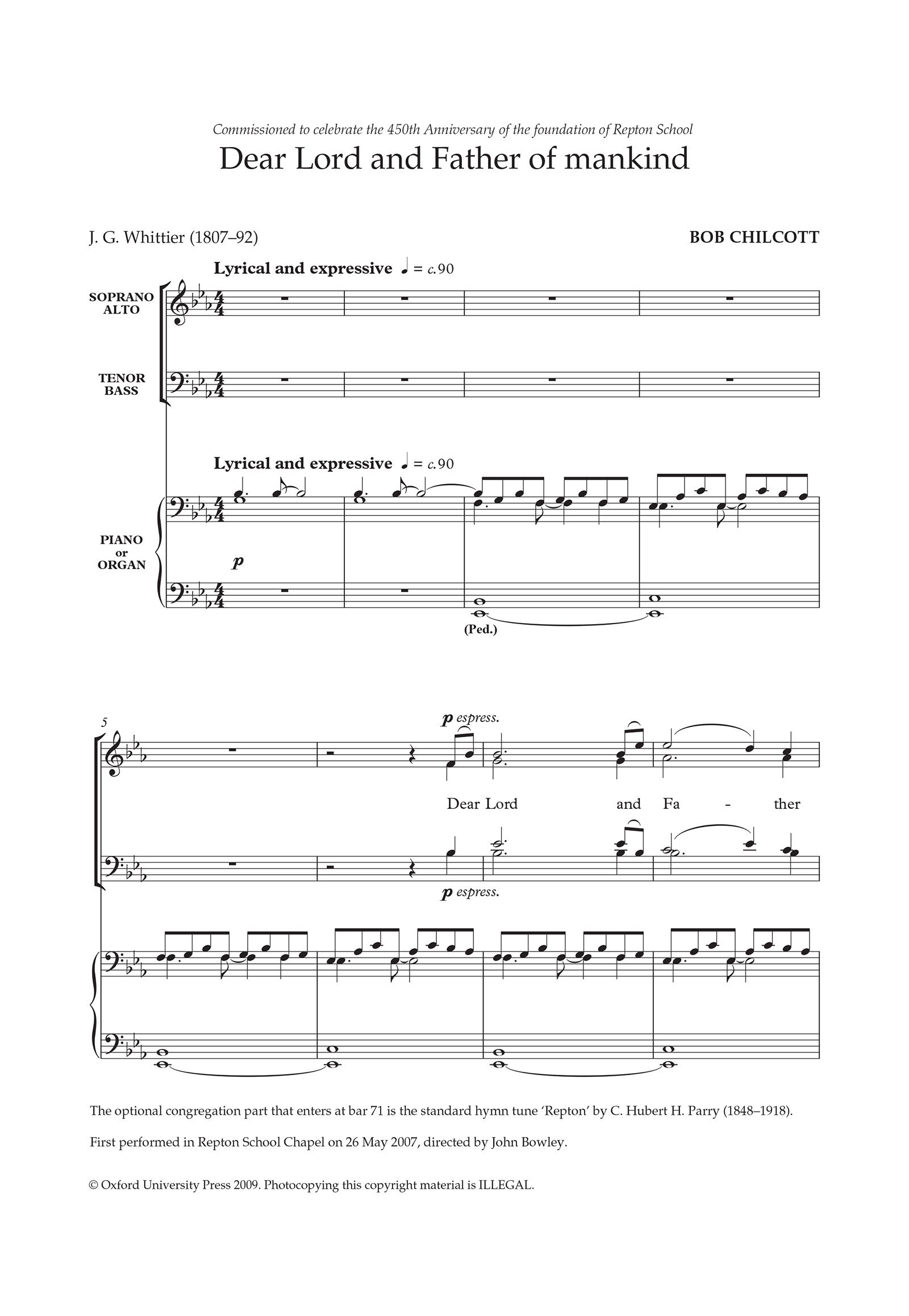 From the collection Bob Chilcott Anthems 2, 'Dear Lord and Father of mankind' is an original, lyrical setting of the familiar Whittier text, scored for SATB with piano or organ (and optional congregation).