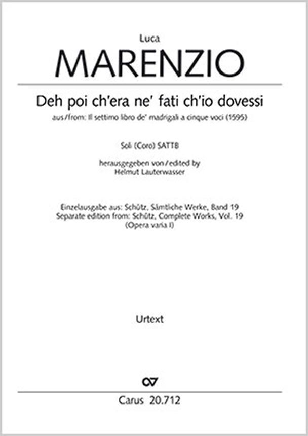 Marenzio zählt neben Gesualdo und Monteverdi zu den großen italienischen Madrigalisten. Seine feinsinnige Madrigalkunst hatte großen Einfluss auf die jüngere Komponistengeneration. Dies belegt die Tatsache, dass Heinrich Schütz das Madrigal 'Deh poi ch'era ne' fati ch'io dovessi' zweimal bearbeitet bzw. schöpferisch nachgestaltet hat: Aus Marenzios weltlichem Madrigal über sechs Zeilen aus 'Il Pastor Fido' von Guarini wurden die geistlichen Madrigale 'Ach Herr, du Schöpfer aller Ding' SWV 450 (Carus 20.450/50) und 450a (Carus 20.450/50).
