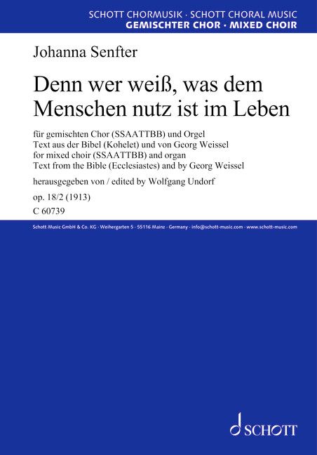 Die Motette Denn wer weiß, was dem Menschen nutz ist im Leben op. 18/2 der Komponistin Johanna Senfter erscheint hier erstmals im Druck. Nach einer von expressiver Chromatik geprägten Einleitung stehen einfachere chorale Einschläge harmonisch wie auch thematisch im Zentrum des Werks. In dieser Motette nimmt der 4-stimmige Männerchor eine größere Rolle ein. Den Abschluss bildet eine umfangreiche Fuge. Der Orgel fallen in diesem Werk unterschiedliche Funktionen zu, von reiner Begleitung bis zum dialogisierenden Partner des Chores.