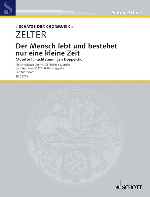 Eine wertvolle Bereicherung für das Repertoire geistlicher A-cappella-Chormusik stellt Carl Friedrich Zelters Motette Der Mensch lebt und bestehet nur eine kleine Zeit dar. Die in der Reihe 'Schätze der Chormusik' erschienene Motette für achtstimmigen Doppelchor (SATB/SATB) wurde schon zu Lebzeiten hoch gelobt: 'Das Ganze zerfällt in drei Teile. Der erste stellt dar: die Hinfälligkeit des Menschen und die Vergänglichkeit aller Welt.' Es folgt ein 'wahres Meisterstück von musikalischer Architektonik, eine achtstimmige Fuge, wie sie nach Johann Sebastian Bach und Fasch selten in solcher Reinheit und Kunst hervorgegangen sein dürfte. Hierauf folgt ein herrlicher Triumphgesang, der gewaltig mit sich fortreißt, so dass die Hörer selbst mit einstimmen möchten.' - Ein in jeder Beziehung lohnendes Werk also, das für ambitionierte Laienchöre problemlos einzustudieren sein dürfte.