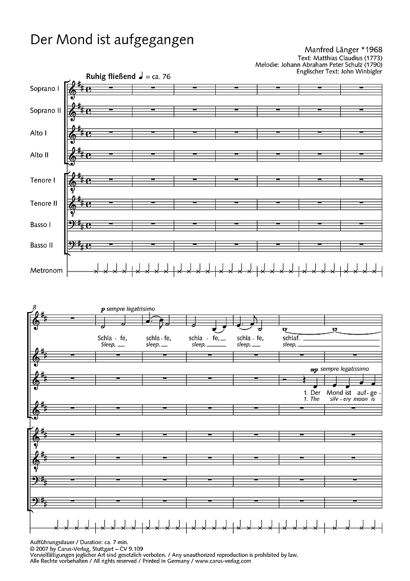 Das Gedicht 'Der Mond ist aufgegangen' von Matthias Claudius ist ebenso bekannt wie beliebt. In der Version von Manfred Länger tritt zu der hörbaren Dimension noch die visuelle hinzu. Der Mond geht auf - gedämpftes Saallicht und Kerzen. Darauf folgt ein harmonisch reicher und stimmungsvoller Chorsatz. Und wenn der Mond untergegangen ist? - Dunkelheit, Stille. Einen besseren Abschluss für ein Konzert kann man sich kaum vorstellen. - Coro SSAATTBB, Teelichter/Kerzen, Mechanisches Metronom