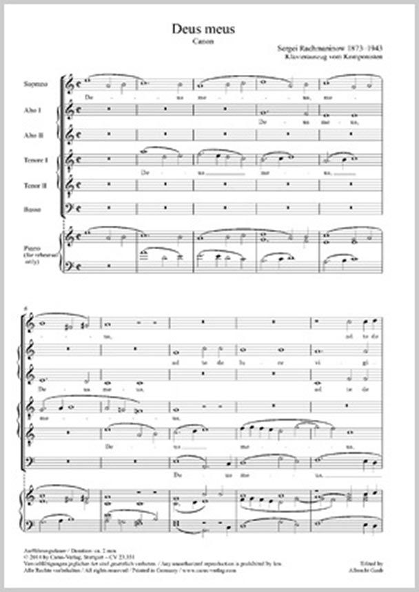 Rachmaninows erste geistliche Komposition, der sechsstimmige Canon Deus meus, entstand Ende 1890 im Rahmen den Kontrapunktunterrichts am Moskauer Konservatorium. Rachmaninow selbst sah dieses kleine Werk sehr skeptisch; bei seinen Lehrern am Konservatorium fand es gleichwohl Gefallen: Rachmaninow erhielt die Bestnote '5' und das Werk wurde für eine Aufführung in einem Klassenabend vorgesehen.
