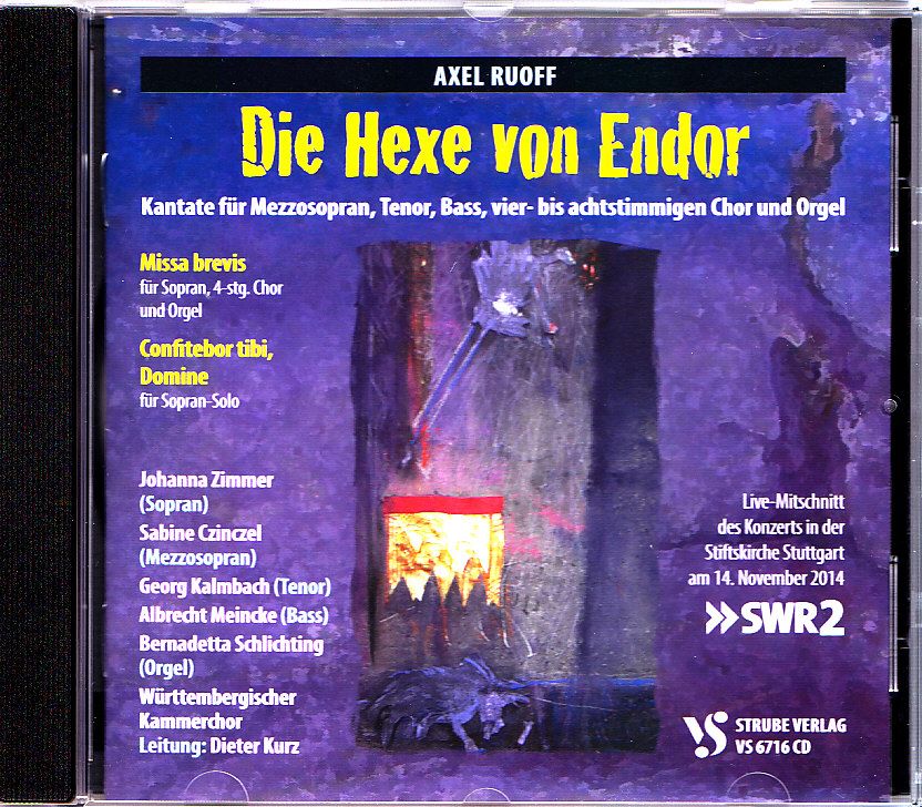 Die Bibelepisode ,Die Hexe von Endor' hat mich schon immer sehr beschäftigt. Sie ist umstritten, da okkulte Praktiken darin auftauchen. Ich habe daraus eine dramatische Kantate entwickelt, wobei ich die Luther-Übersetzung vertonte, kombiniert mit Motiven aus der jüdischen Mythologie', erläutert Axel Ruoff. Das Werk wurde im Juni 2012 in Bourget-du-Lac in der Kirche Saint Laurent beim Festival 'Les Voix du Prieure' erfolgreich uraufgeführt. Laut Dieter Kurz 'ein schweres, aber unterhaltsames Stück mit dramatischen Qualitäten, von den Ausführenden sehr geschätzt, das dem Chor mit Rezitativen, Sprechen und dramatischem Singen sowie dem Betätigen von rund 20 Schlaginstrumenten alles abverlangt'. Auch für den Orgelpart brauche man 'eine Organistin von Gottes Gnaden', die Kurz in Bernadetta Sunavska gefunden hat, denn sie sei 'in Kopf und Fingern irrsinnig schnell'.