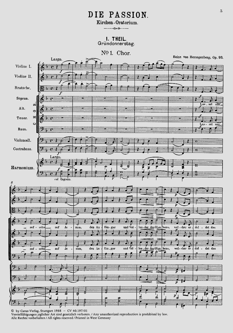 Oratorium für Gründonnerstag und Karfreitag. Soli SATTBarB, Coro SATB, Gde, 2 Vl,Va, Vc/Cb, Armo, Org