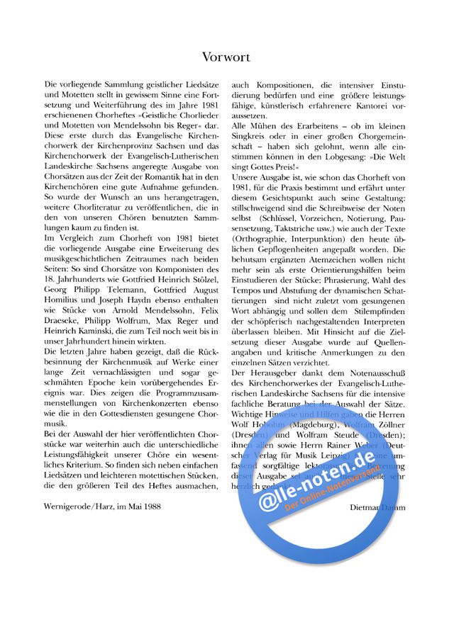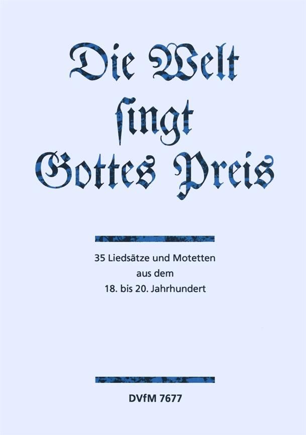 Die Welt singt Gottes Preis' - der Titel leitet sich von der Choralmelodie Johann Wolfgang Francks ab, die in Arnold Mendelssohns Satz in den Band aufgenommen ist. Die umfangreiche Chorsammlung (116 Seiten) enthält Werke von C. Ph. E. Bach, Gottfried August Homilius, Joseph Haydn, Moritz Hauptmann, Felix Mendelssohn Bartholdy, Johannes Brahms, Max Reger u. v. a. m. und versteht sich als Fortsetzung des Heftes 'Geistliche Chorlieder und Motetten von Mendelssohn bis Reger' (DV 7672), das seit Herbst 1993 wieder erhältlich ist.