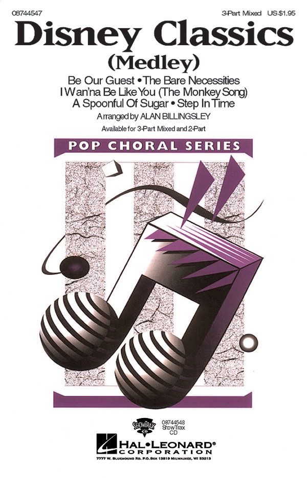 Audiences and singers will love the happy, upbeat music in this delightful mini-medley of Disney favorites. Includes: Be Our Guest, The Bare Necessities, I Wan'na Be Like You (The Monkey Song), A Spoonful of Sugar , and Step in Time . Available for 3-Part Mixed and 2-Part. ShowTrax CD also available. Performance Time: Approx. 7:00