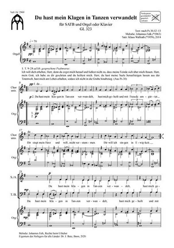 Für viele Kirchenmusiker und Gottesdienstbesucher zählt das Lied 'Du hast mein Klagen' mit der ungemein berührenden Melodie von Johannes Falk zu den beliebtesten Liedschöpfungen der letzten Jahre. Folgerichtig wurde es auch in die neue Fassung des Gotteslob aufgenommen (GL 323). Klaus Wallrath greift den melodie- und harmoniebasierten Stimmungsgehalt des Liedes in idealer Weise auf und schafft einen Satz von berückender Intensität, der den Wandel von Klage und Trauer zu Freude und Tanz eindrucksvoll nachzeichnet. Die Begleitung kann wahlweise durch Orgel oder Klavier erfolgen. Der Satz ist auch in einer kompatiblen Fassung für Oberstimmenchor erschienen (BUTZ2971).