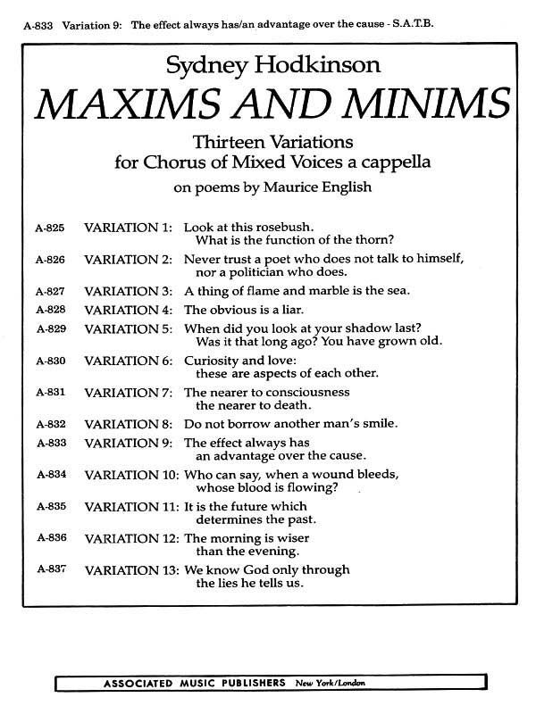 Sydney Hodkinson's The Effect Always Has/An Advantage Over The Cause for SATB choir a cappella. From 'Maxims And Minims' - thirteen variations on poems by Maurice English.