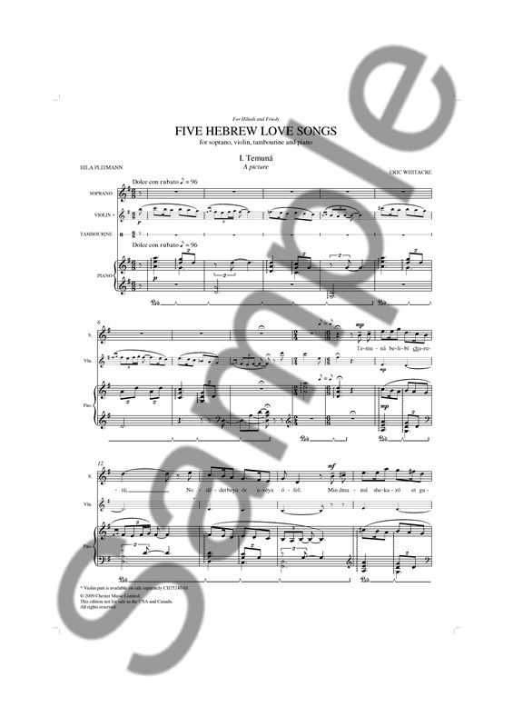 Jeder Satz dieser Suite ist eine 'musikalische Postkarte', die romatische und intensive Momente einer Reise durch die Schweiz wiedergibt. Die Lieder sind der aus Jerusalem stammenden Hila Plitman, die den wunderbaren Text verfasst hat, sowie derEhefrau des Komponisten gewidmet. Die Suite ist für SATB gesetzt und kann entweder von einem Streichquartett oder Klavier und Violine begleitet werden.