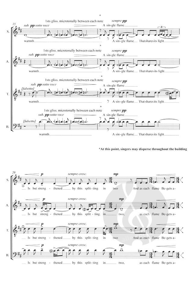 Originalfassung für 12 unbegleitete Stimmen. Das zentrale Thema von „Flame“ ist die Weitergabe von Licht und Glück von Mensch zu Mensch. Bardsleys Text ist von einem Zitat des Siddharta Gautama Buddha inspiriert und legt die Vorstellung nahe, dass das geteilte Licht einer Kerze dadurch verstärkt und nicht geschwächt wird. Die spirituelle Qualität des Gedichts wird in Parrys Musik perfekt eingefangen. Sie beginnt mit einer einzigen, flackernden Melodie, die von den oberen zu den unteren Stimmen wandert, bevor sie sich mit der Vervielfachung der Flamme zu einer zwölfstimmigen Harmonie entfaltet und in der bekräftigenden Schlusszeile „so to light the world“ gipfelt.