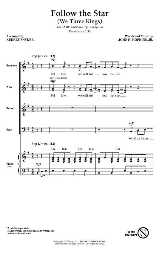 This setting of We Three Kings has a fresh, contemporary drive to it, with opportunities for the men's section to shine! Easily learned, it will add energy and vitality to holiday programs!