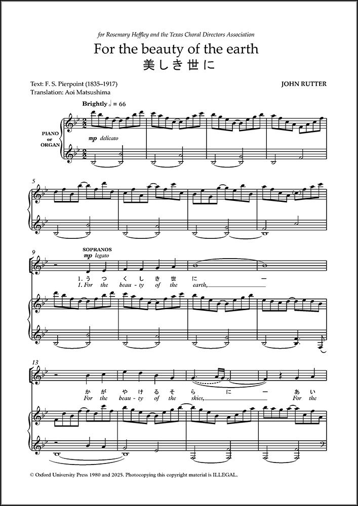 In this classic Rutter anthem the flowing choral melodies perfectly complement the positive message of the well-known thanksgiving text by F. S. Pierpoint, presented here in Japanese translation.