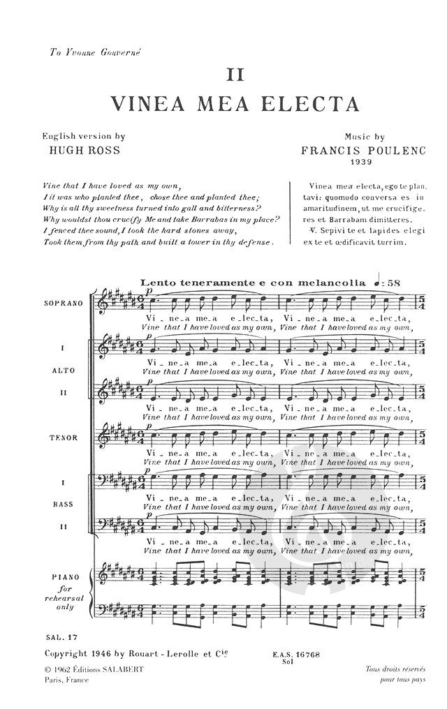 The pain and suffering of Passiontide is evoked in the austere texts of these four motets. Using somber, bittersweet harmonies and angular melodies alongside more comfortable, chorale-like textures, Poulenc creates rapid, effective changes of mood. Though the performance of this music is challenging, its passionate spirituality makes the task worthwhile.