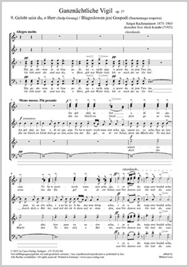 Sergej Rachmaninows Ganznächtliche Vigil ist sein letzter Beitrag zur russisch-orthodoxen Kirchenmusik. Die liturgische Vorlage ist der Gottesdienst am Vorabend kirchlicher Feiertage und besteht aus einer Abfolge von Gebeten, Lesungen und Gesängen. Rachmaninow gelang es, in seiner Komposition für Chor a cappella originale Kirchengesänge mit Neuschöpfungen zu einer Einheit zu verschmelzen und eine solche emotionale Tiefe zu erreichen, dass der Vesper bei ihrer Uraufführung im Jahre 1915 ein triumphaler Erfolg beschieden war. Die vorliegende Neuausgabe unterlegt den Noten den originalen kirchenslawischen Text sowohl in der Duden-Transkription als auch in einer singbaren deutschen Übersetzung und gibt Aussprachehilfen für den kirchenslawischen Text.