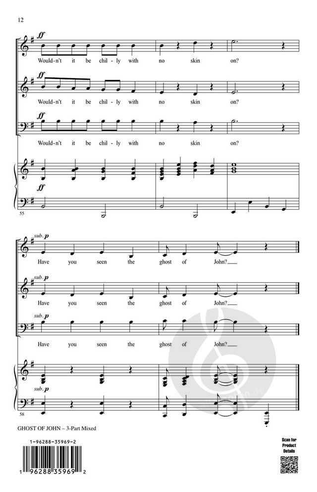 Dieser gespenstische Folk-Favorit begeistert die Sängerinnen und Sänger mit einem schwungvollen Swing-Stil, einer klaren Diktion und einer ausdrucksstarken Dynamik. Die optionale Beteiligung des Publikums durch einen geflüsterten Gesang von Ghost, Ghost, Ghost of John sorgt für eine unterhaltsame und unvergessliche Aufführung. Perfekt für junge Chöre, die nach einer Mischung aus Spielfreude und Kunstfertigkeit suchen.