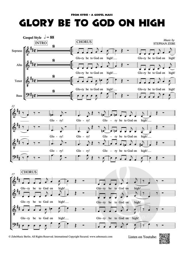 Beliebtes Uptempo-Gospel-Gloria für gemischten Chor, geeignet ebenso im liturgischen wie im konzertanten Zusammenhang. Diese Bearbeitung enthält einen SATB-Part. Ebenso ist die Gospel-Reprise enthalten; eine Zugabe zum dem Song, die noch einmal in typischer Weise musikalisch das große Gospelgefühl aufgreift. Im Notendownload sind ausgeschriebene Partitur mit Klavier und Akkordsymbolen sowie die Chorpartitur enthalten. Das downloadbare Playback kann gut unterstützen, sei es in Probe oder zum Auftritt. Es enthalt auch die Reprise.