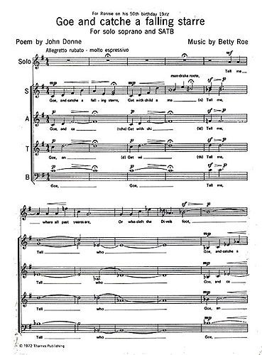 A fantastic choral piece by Betty Roe, based on a classic Metaphysical poet John Donne. This romantic and expressive piece is scored for unaccompanied Solo Soprano and SATB mixed choir.