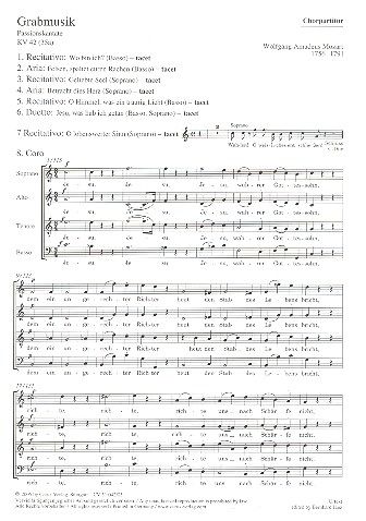 Passionskantate - Die kritische Carus-Neuausgabe kann sich - als erste Ausgabe überhaupt - auf die beiden Autographen stützen, die Mozart getrennt für die Sätze 1-6 und 7-8 anfertigte. Als durchaus sensationell kann die Tatsache bezeichnet werden, dass die Edition im Schlusssatz zwei zusätzliche originale Hornstimmen enthält, die noch nie im Druck erschienen sind. So besteht die Möglichkeit die Grabmusik wieder in Mozarts Instrumentation aufzuführen.