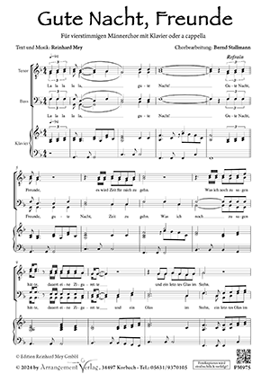 "Gute Nacht, Freunde" wurde von Alfons Yondraschek (Reinhard Mey) geschrieben. Mit diesem Lied nahmen Inga & Wolf am deutschen Vorentscheid des "Eurovision Song Contest" 1972 teil und erzielten einen vierten Platz. Erst danach wurde es von Reinhard Mey veröffentlicht. Dieses Chanson gehört mittlerweile zum deutschen Kulturgut und hat generationenübergreifend Kultstatus erlangt. In unserer Version für Chor ist der Titel sowohl a cappella als auch mit Klavier zu singen.