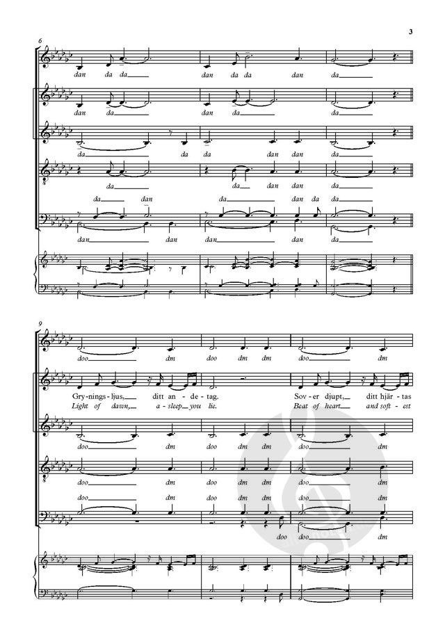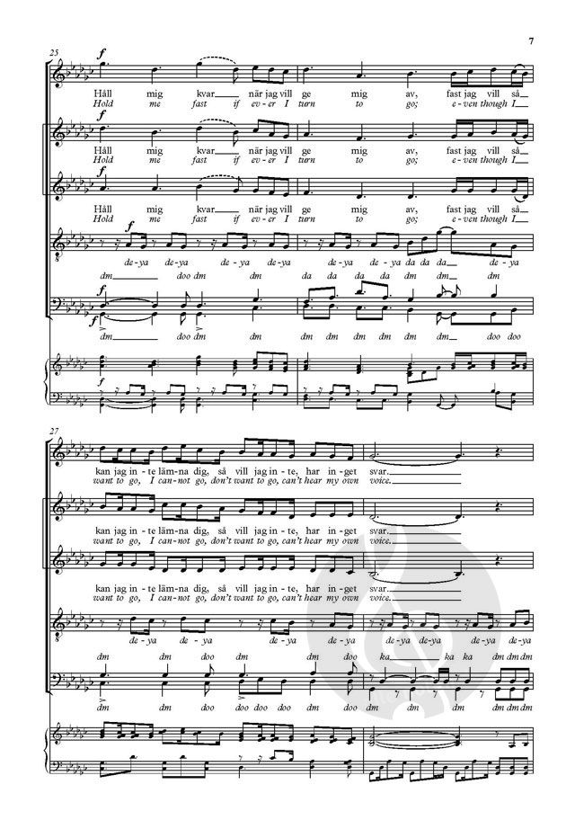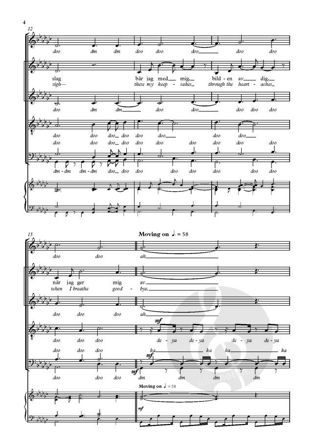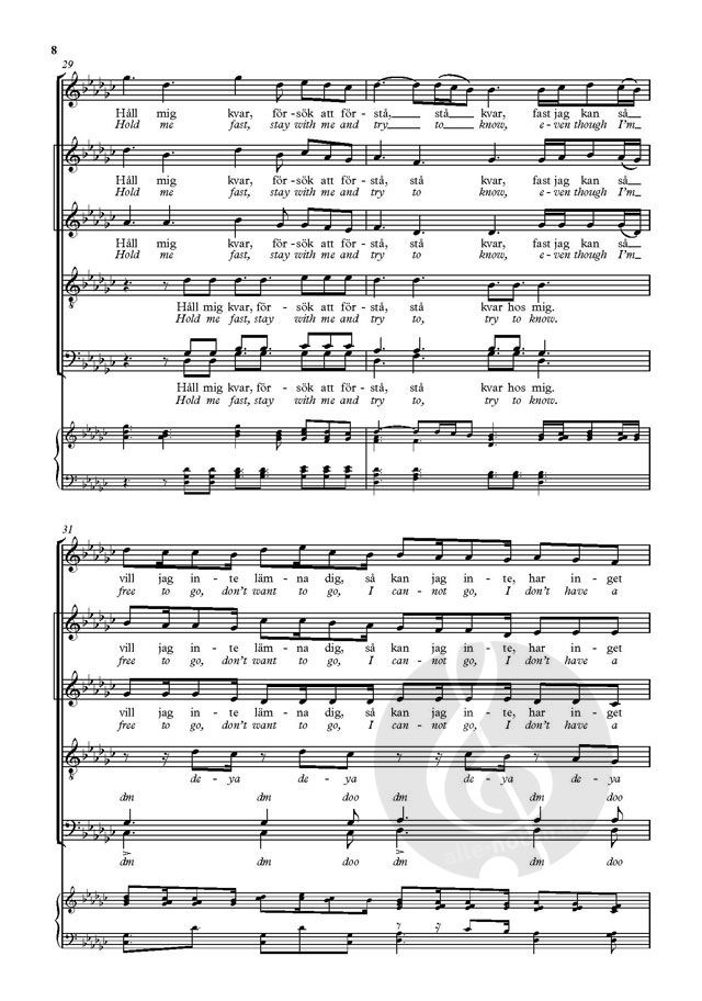 The signature tune for the award-winning Swedish a cappella group Vocado, this is a poignant love song. This dual-language publication in the Voice Junction series is perfect for vocal groups and choirs singing in Swedish or English.