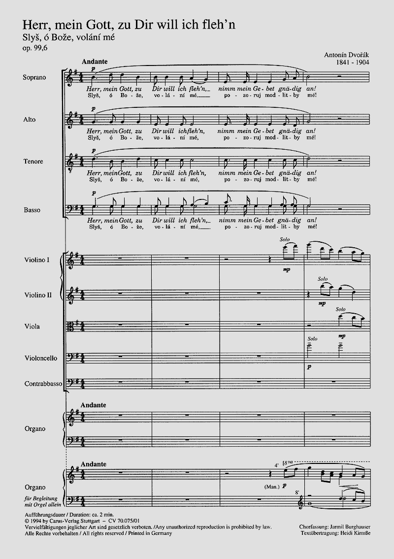 Die 'Biblischen Lieder' op. 99 entstanden während Dvoráks Aufenthalt in den Vereinigten Staaten. Diese Zeit von 1892 bis 1895 brachte dem Komponisten triumphale Erfolge und begründete seinen Weltruhm. Sie war aber andererseits auch von schweren psychischen Bealstungen bestimmt, die Dvorák zu ertragen hatte. So führte die lange Abwesenheit von seiner Heimat zu einem sich verstärkenden Heimweh. Die Lieder sind in ihrer Schlichtheit der Faktur, dem Fehlen jeglicher Künstlichkeit sowie im freien Fluss unmittelbarer Inspiration Ausdruck dieser besonderen psychischen Situation des Komponisten. - Coro SATB, 2 Vl, Va, Vc, Cb, Org