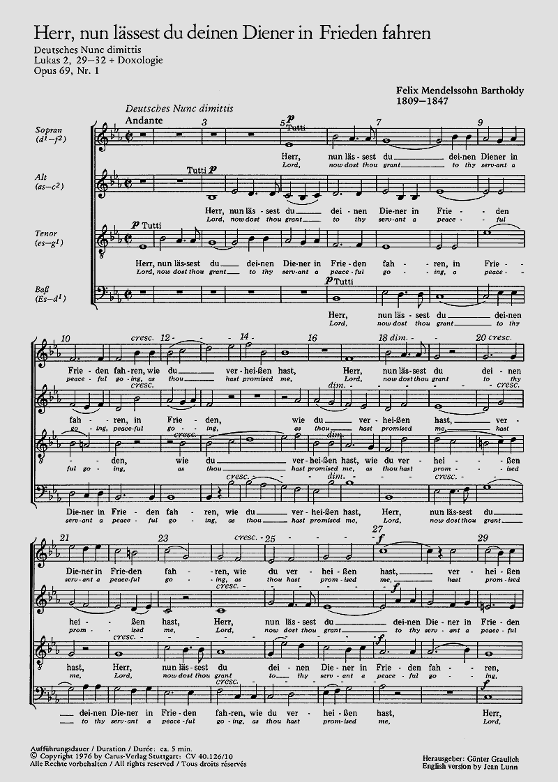 Die Drei Motetten op. 69, das Jubilate Deo, das Nunc Dimittis und das Magnificat, waren ursprünglich für den anglikanischen Gottesdienst bestimmt, mit dessen reicher chorischer Tradition Mendelssohn auf seinen zahlreichen Englandbesuchen vertraut geworden war. - Coro SATB