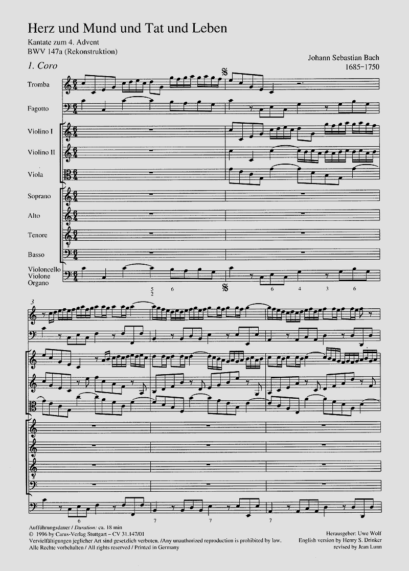 Urform der späteren Fassung BWV 147, entstanden in Weimar. Soli SATB, Coro SATB, Tr, Obca, Fg, 2 Vl (Vl sol), Va, Vc/Cb, Org