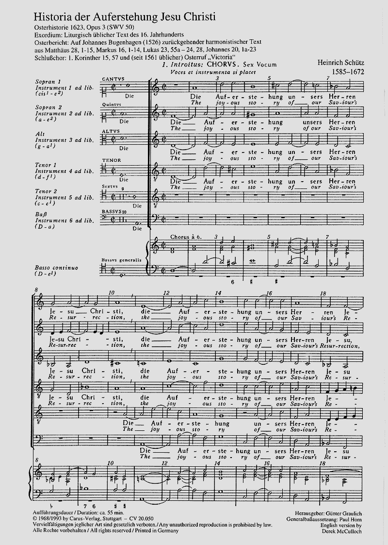 Mit seiner Auferstehungshistorie setzte Schütz die etwa siebzigjährige Tradition der Komposition biblischer Historien fort, die Friedrich Blume die 'eigenartigsten und geschichtlich bedeutendsten Leistungen der protestantischen Musik' genannt hat. - Fav SSSATTBarB, Coro SATB/SATB, 4 BVga, Org - Tonart d-dorisch